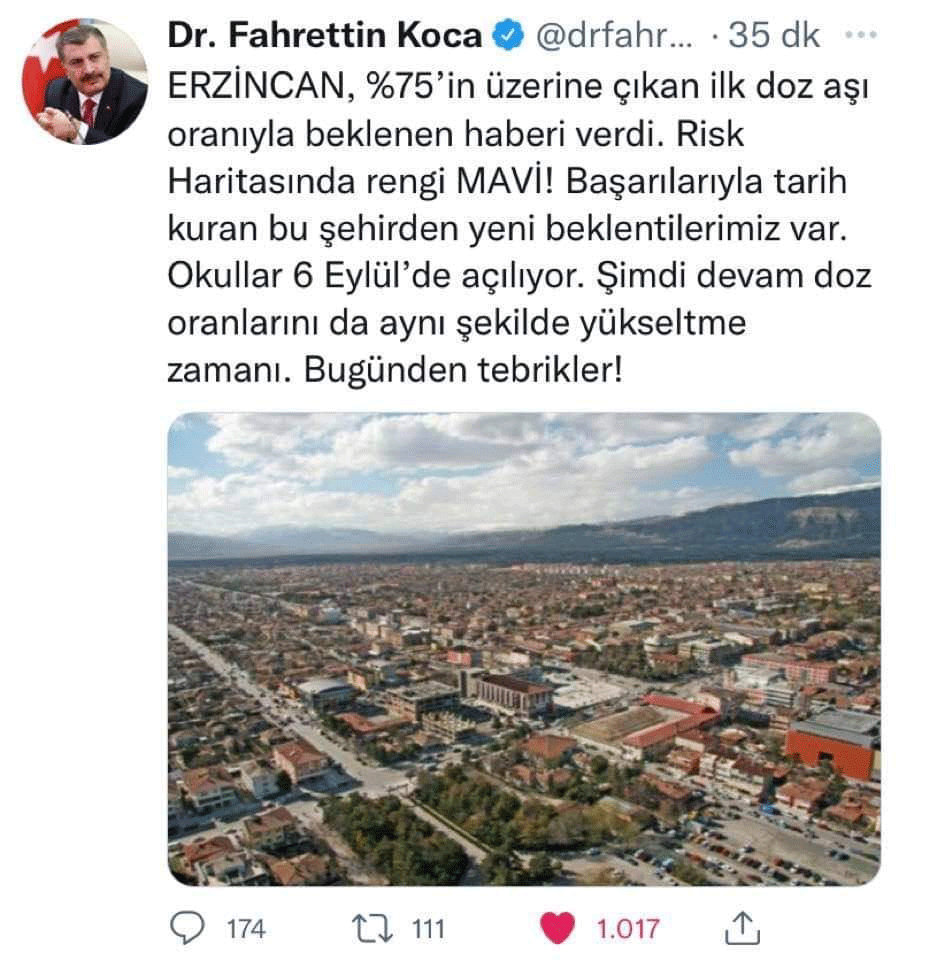 Erzincan, yüzde 75’in üzerine çıkan ilk doz aşı oranıyla beklenen haberi verdi. Risk haritasında rengi mavi. Başarılarıyla tarih kuran bu şehirden yeni beklentilerimiz var.”