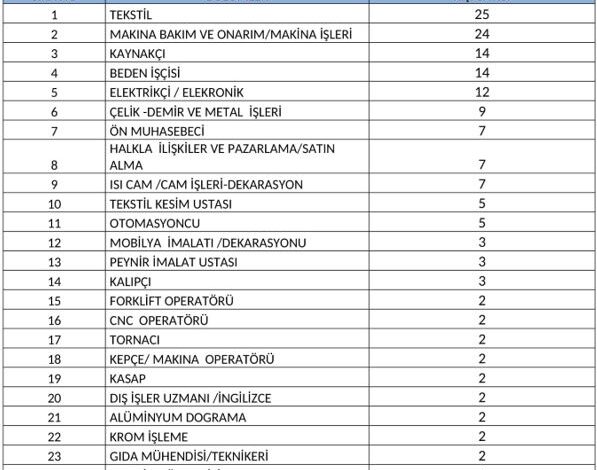 Bölümler ve talep edilen kişi sayısı şöyle; Tekstil: 25, Makine bakım ve onarım/makine işleri: 24, Kaynakçı: 14, Beden işçisi: 14, Elektrikçi/elektronik: 12, Çelik-demir ve metal işleri: 9, Ön muhasebe: 7, Halkla ilişkiler ve pazarlama/satın alma: 7, Isı cam/ cam işleri -dekarasyon: 7, Tekstil kesim ustası: 5, Otomasyoncu: 5, Mobilya imalatı/dekarasyon: 3, Peynir imalat ustası: 3, Kalıpçı: 3, Forklift operatörü: 2, Cnc operatörü: 2, Tornacı: 2, Kepçe/ makine operatörü: 2, Kasap: 2, Dış işler uzmanı/ ingilizce: 2, Alüminyum doğrama: 2, Krom işleme: 2, Gıda mühendisi/ teknikeri: 2, Tekstil mühendisi: 1, Aşçı: 1, Plastik işleme ustası: 1, Pres ustası: 1.