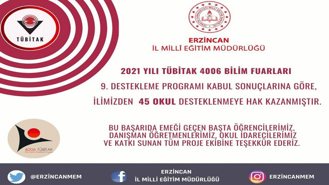 2021 yılı TÜBİTAK 4006 Bilim Fuarları 9. Destekleme programı sonuçlarına göre Erzincan’dan 45 okulun 4006 Bilim Fuarı projesi desteklenmeye hak kazanmıştır.