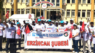 Öz-Sağlık İş Sendikası üyelerinin gerçekleştirdiği basın açıklamasında sendika adına açıklama yapan Öz Sağlık İş Sendikası Erzincan Şubesi Başkanı Metin Bulut,…