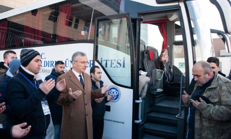 Üniversite Rektörlük binası önünden hareket eden EBYÜ gönüllü arama kurtarma ekibini, Üniversite Rektörü Prof. Dr. Akın Levent, Üniversite Rektör Yardımcıları Pof. Dr. A. Ercan Ekinci, Prof. Dr. Adem Başıbüyük, Prof. Dr. Çağrı Çırak ve Genel Sekreter Doç. Dr. M. Cihat Özgenel başta olmak üzere birçok akademik ve idari personel uğurladı.