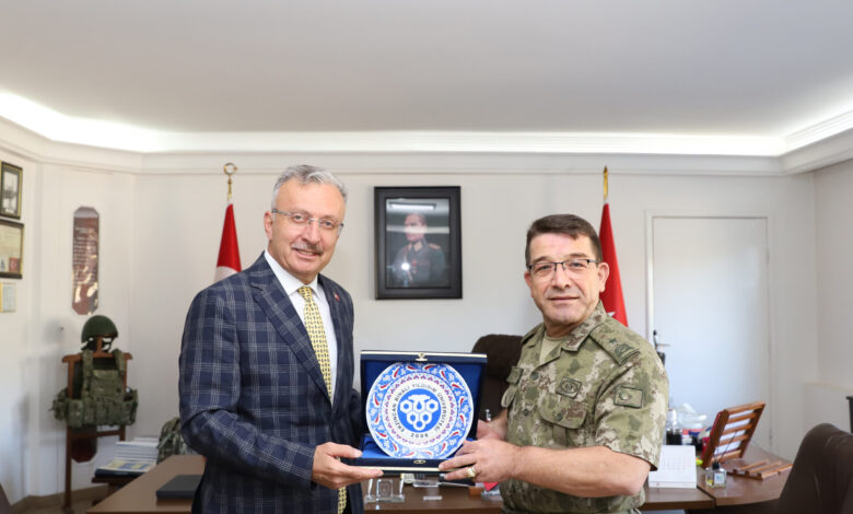 Erzincan Binali Yıldırım Üniversitesi Rektörü Prof. Dr. Akın Levent, 59. Havan ve Topçu Eğitim Tugay Komutanı Tuğgeneral Mahmut Büyükcingi’yi ziyaret etti.