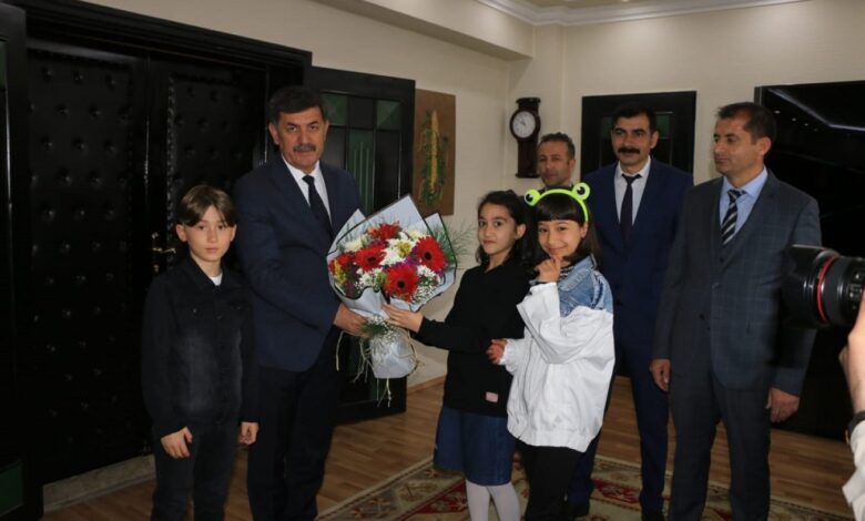 23 Nisan Ulusal Egemenlik ve Çocuk Bayramı vesilesiyle İnönü İlkokulu Öğrencileri Emir Baybars Kefçi, Bengisu Şişman, Meryem Nur Ariz, İl Milli Eğitim Şube Müdürü Mecit Sarı, Okul Müdürü Kadir Aydın ve Öğretmen Selçuk Kafkas Başkan Aksun’a ziyarette bulundular.