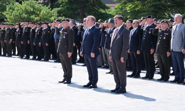Türk Bayrağının tören alanına gelmesinin ardından Erzincan Valiliği, Garnizon Komutanlığı ve Erzincan Belediye Başkanlığı çelenkleri Atatürk anıtına sunuldu.